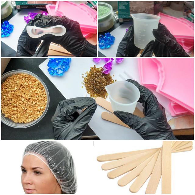 У набір входить силіконова склянка 100 мл, 7 дерев'яних шпателів для перемішування смоли, вузькі дерев'яні палички з гострим кінцем для виведення пухирів(6 шт), шапочка для захисту волосся, 4 довгих піпетки для фарб і пігментів, 1 пара рукавичок, пеньюар.